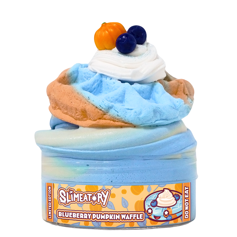 This swirled blue and beige butter slime brings a comforting mix of cozy and cool! Topped with a waffle clay piece, fluffy white whipped cream slime, sparkly blue glitter, and a touch of blueberry and pumpkin charm magic—it’s breakfast bliss in every squish!