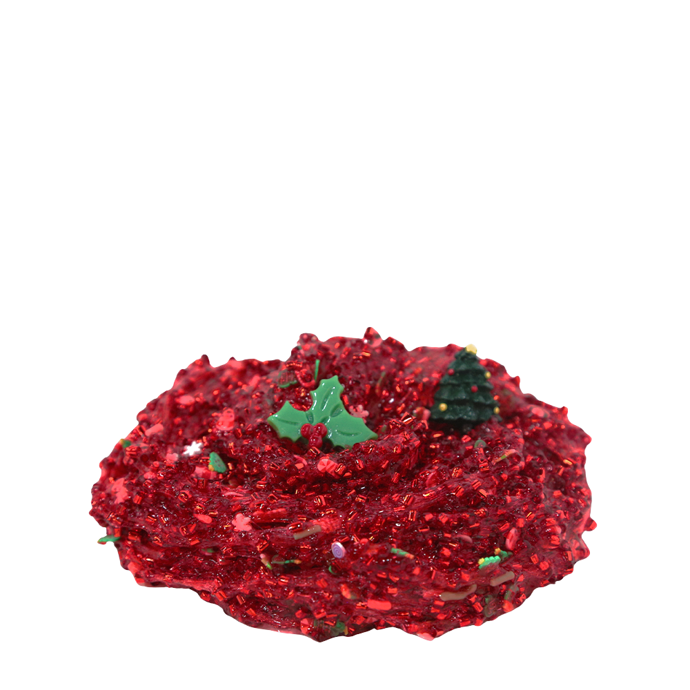This deep maroon bingsu slime compliments the calming vibes of winter! Packed with binsgu beads, festive pieces, and topped with a charming mistle toe, this crunchy centerpiece is a treat for the eye and senses!