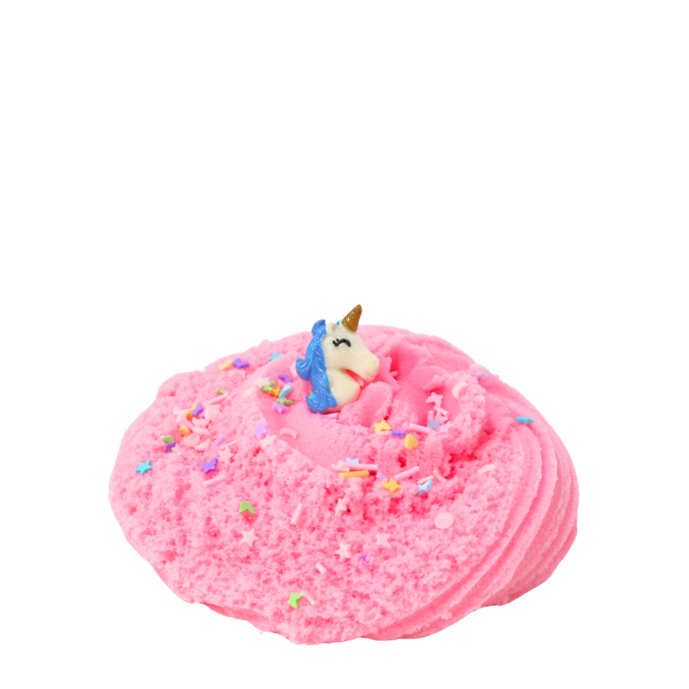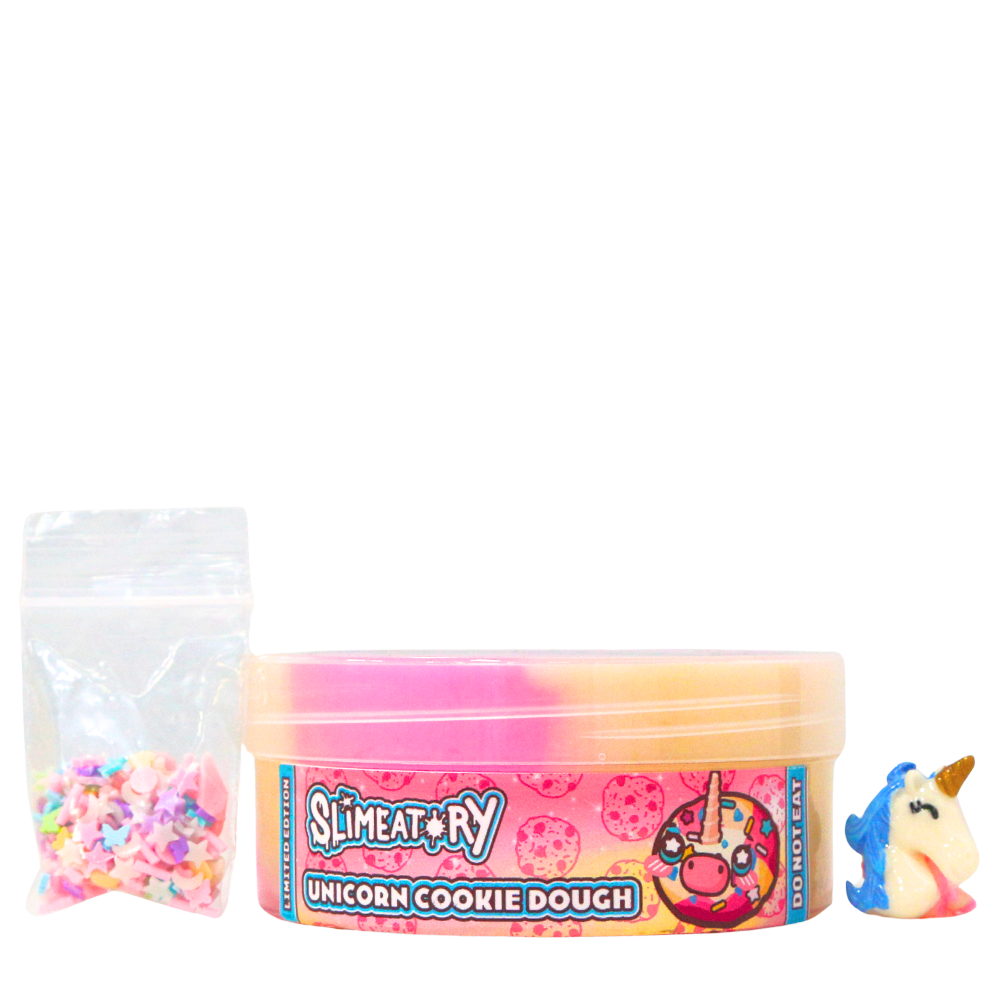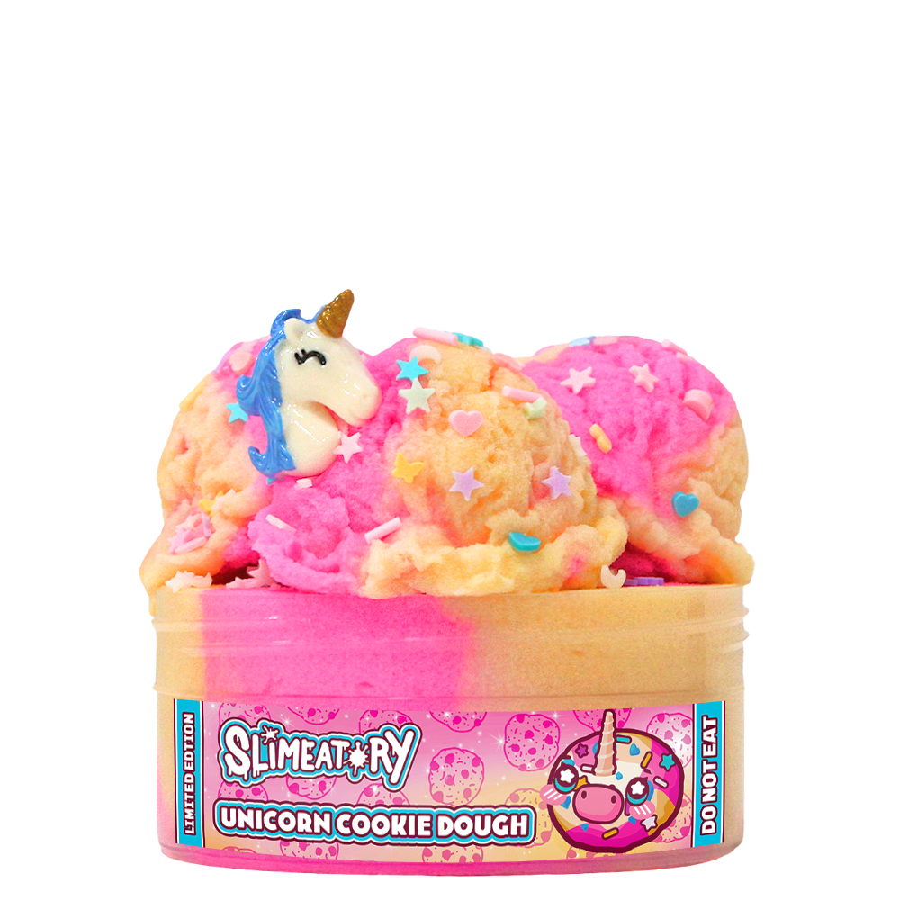 This golden butterscotch and pink swirled cloud slime blends cozy cookie dough tones with a touch of magic! Filled with pastel stars, hearts, and butterfly sprinkles and topped with a unicorn charm, it’s a soft, whimsical treat that feels both comforting and enchanted!