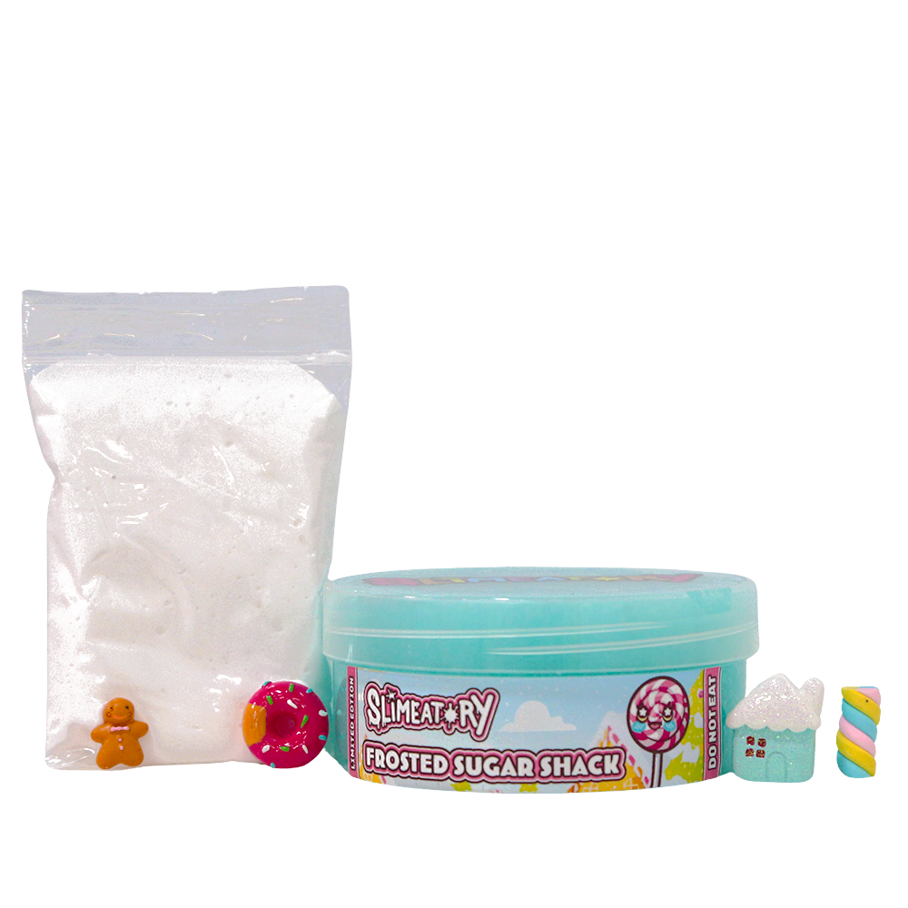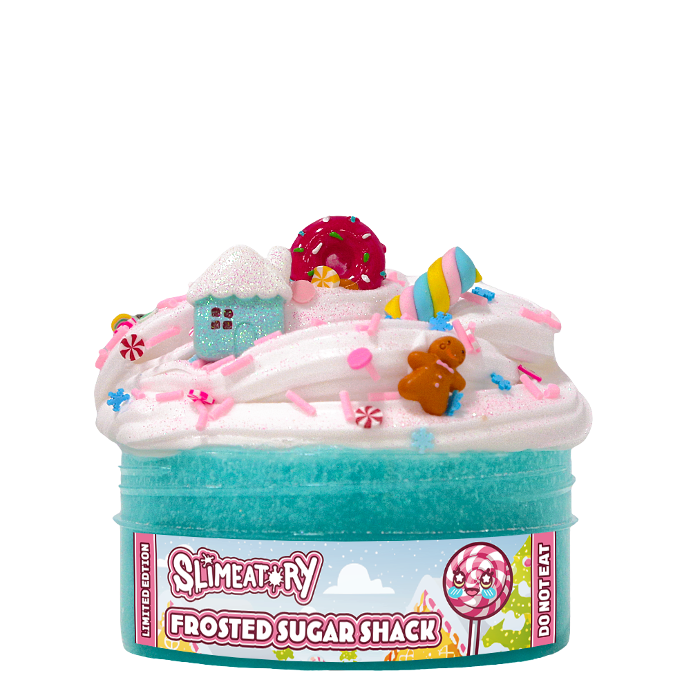 This frosty teal jelly slime is brimming with wintery holiday cheer! Topped a silky smooth layer of white frosting and an assortment of festive candy charms, treat yourself to this sweet seasonal squish!