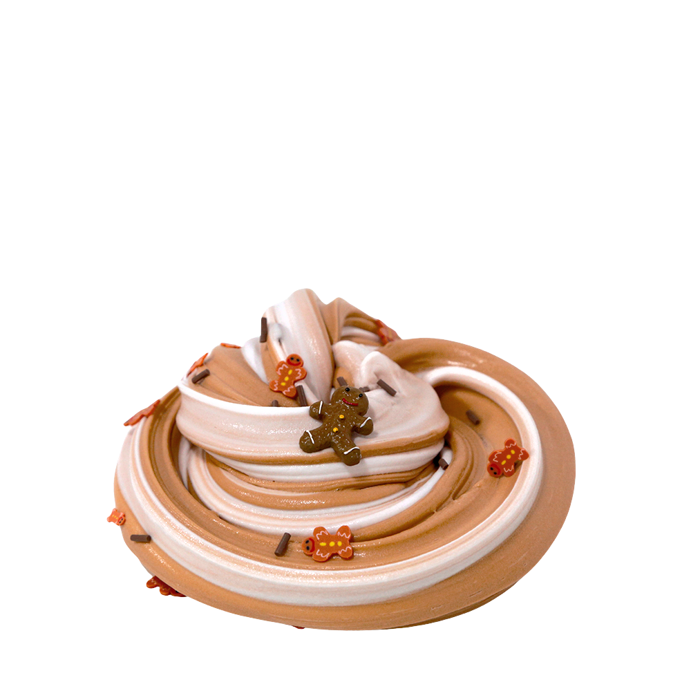 This cozy tan and brown swirled butter slime is the perfect holiday latte! Sip into the season with a steamy treat topped with white whipped cream slime, gingerbread sprinkles, and an adorable gingerbread man charm!
