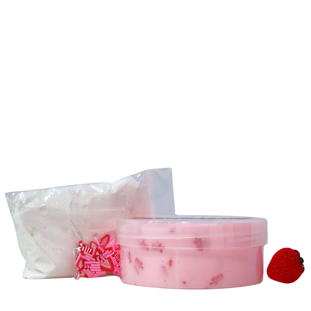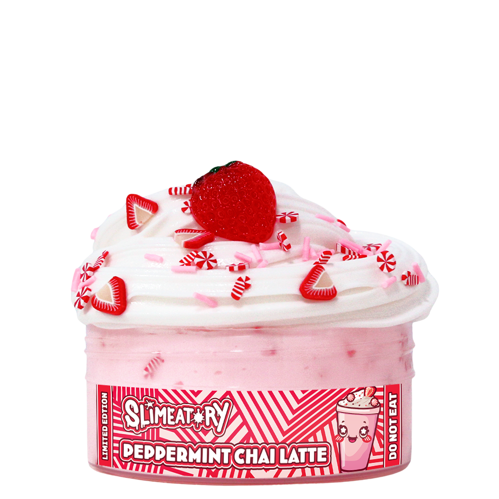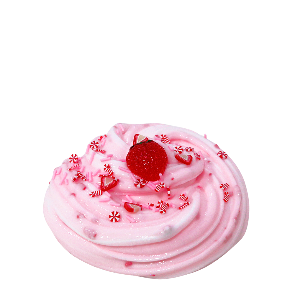 This light pink slime is a festive fusion of peppermint, fresh strawberries, and creamy whipped cream! This chai-inspired slime is topped with peppermint pieces and juicy strawberry charms, sure to sweeten up your holiday!